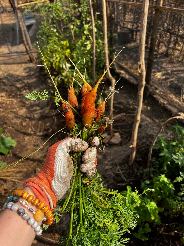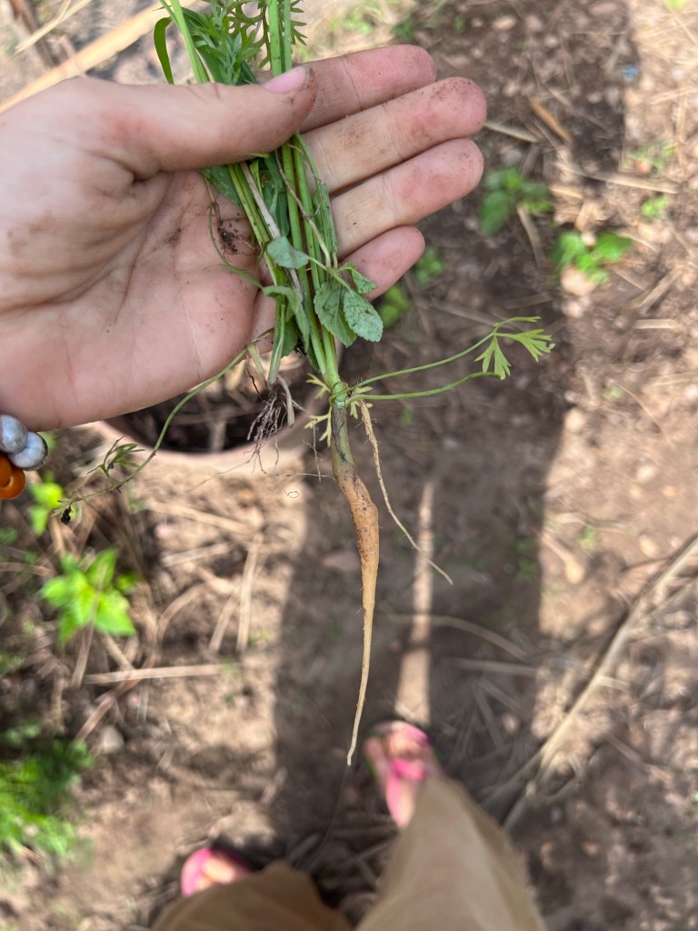 Carrots have been a satisfying project. They don’t take too much work. Ive had to learn to be brave and firm with myself while thinning them out. It just feels like a waste, but I know it’s necessary. I hope the carrots will also work to keep the soil a little looser for the future.