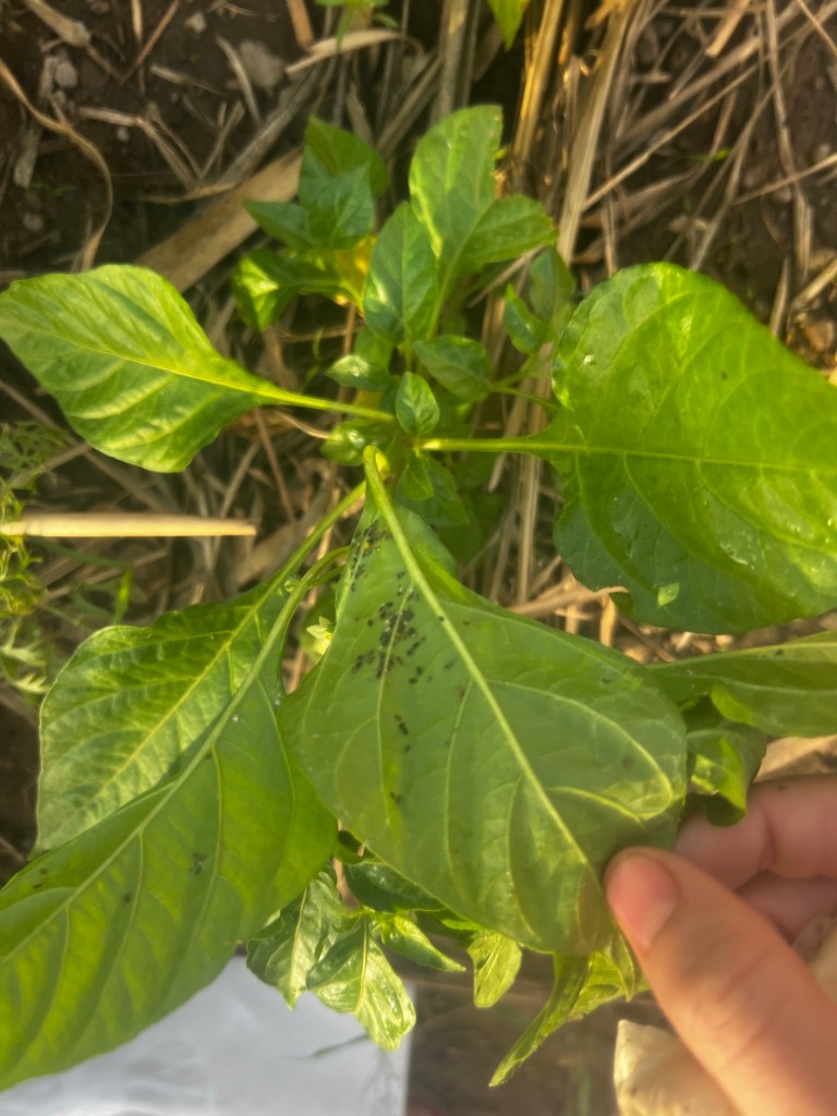 Little black bugs (aphids?) arrived on my eggplant and peppers a couple weeks ago. Luckily this time, I was home at the beginning of the arrival. I’ve been wiping down the leaves with slightly soapy water and picking off the bugs where ever I can. Luckily this seems to have stopped them, but I may attempt a neem seed or neem leaf treatment as an organic insecticide soon. Caterpillars have arrived a couple times too and I have just picked ’em up and squished them. (I’m getting really tough). Overall, I think my companion planting strategies have helped keep bugs down. And since I have a small garden, the labor-intensive combat strategies (like cleaning each leaf) are do-able for me.