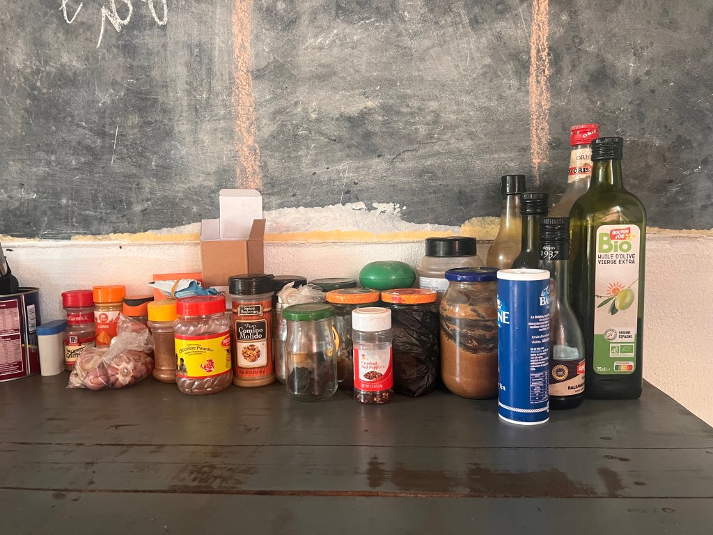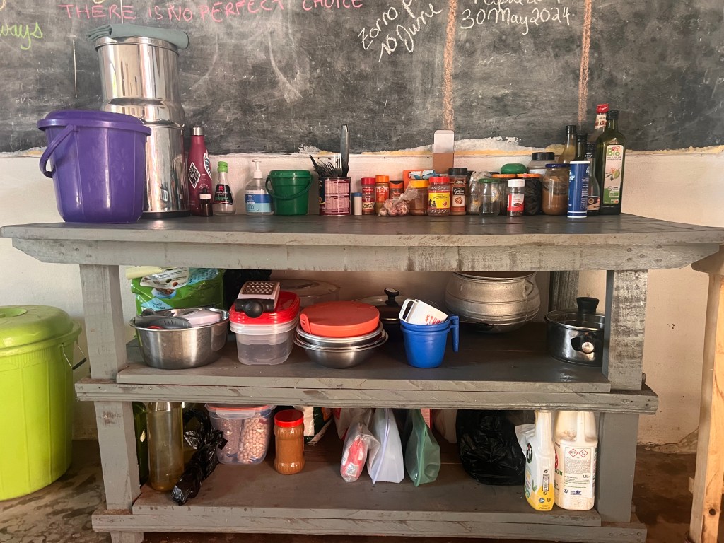Living for two years in this house is the most settled I have been since our little blue house in Portland. I would love to say that I have made it really nice. But other than some photos on the wall and a large chalkboard for decorations, it is pretty utilitarian. But I am proud of little tricks I have come up with to improve the functionality. There is no chance of a fridge for me. But I have found by placing my fruit and vegetables in baskets (lifted off the floor just a bit by tomato paste tins) next to my water barrel they can keep cool enough to last the week between markets. I have a system for lining up my filtered and bleached water in neat rows underneath the water filter. The house came with a bed, a couple of shelves, some rows of hooks, and a small coffee table. The furniture I added is simple: a long high table for a kitchen counter, a small dining table (also works as my writing desk), a long wooden bench, a small short stool, and four plastic chairs. The investment in my kitchen counter was great: all my dishes, dry goods, and cleaning supplies fit neatly inside. In my bedroom, I use a tall book shelf and my packing cubes to make a dresser and vanity combo. My bicycle fits squarely to one side of the door and I can tuck my broom, washboard, and gardening tools behind it. I do have room for a couch and maybe some other luxuries, but they were not my first priority and, as time continued, I found them not necessary. I have a nice mat that I can roll out and place some pillows on when I want to lounge.
