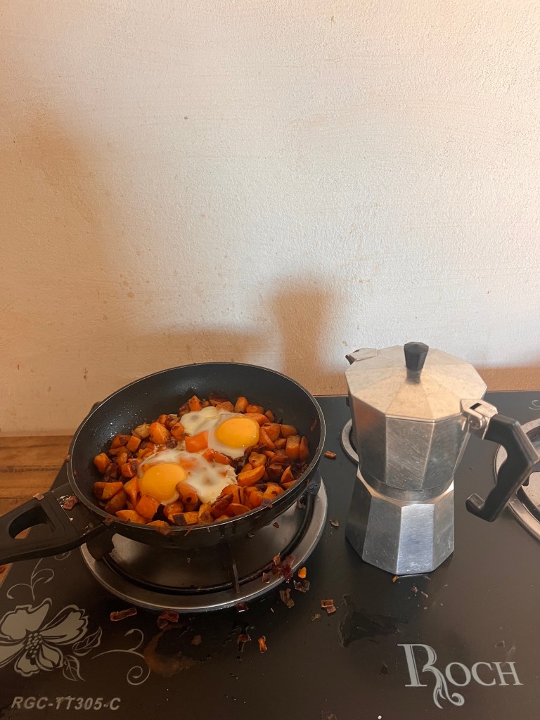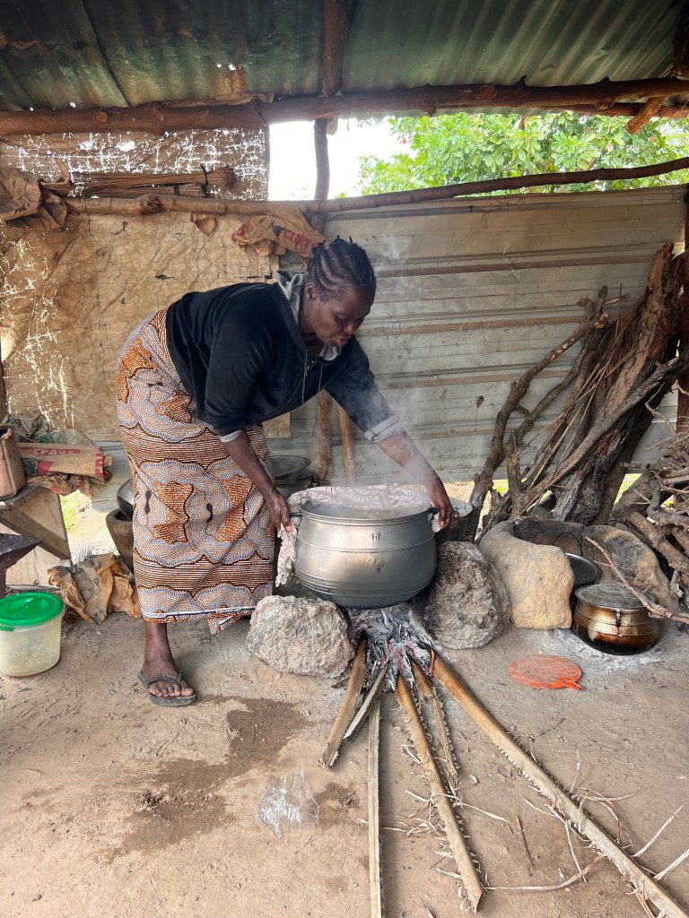 I cook breakfast and lunch for myself and my host mom brings me dinner each night. I have a three-burner gas stove. My host mom uses a three-stone stove wood fire. Usually she has a couple of fires going at once.