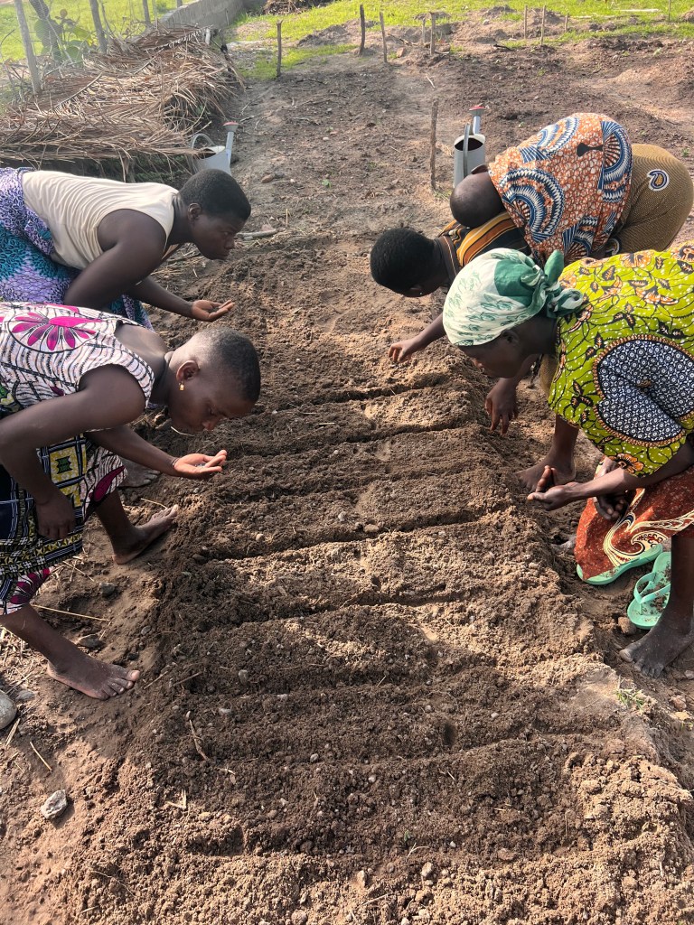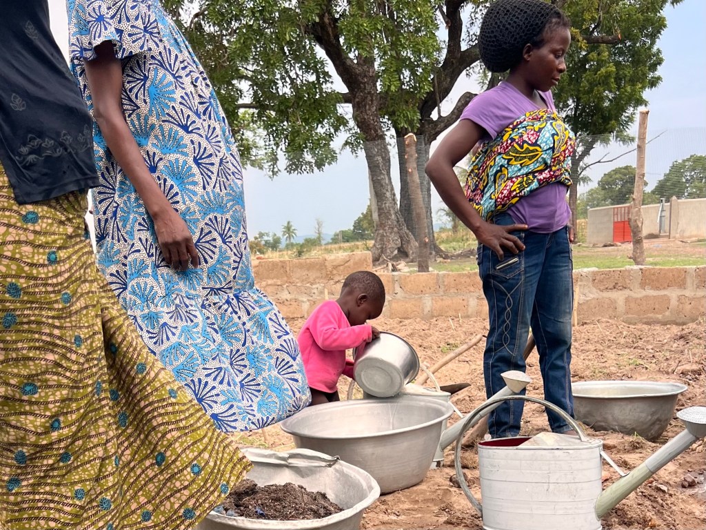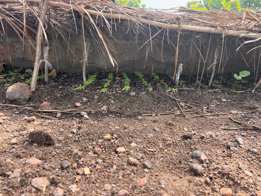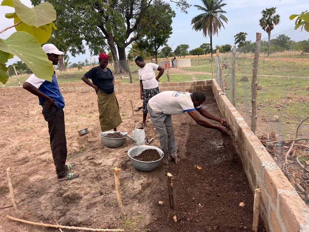 Our community garden work in Koukoude is in full swing now. On April 10th, we planted the first seeds in our plant nursery. In addition to daily watering, once a week the group gathers for a big work day. We have a compost pile to be turned and watered, more garden beds to be built, and weeding. Coming up this week, we will transplant a few seedlings. There are a few hiccups — the arrival of ants, for one — but it gives us a chance to learn together. Yesterday, with the middle school agriculture club we made neem leaf insecticide. A couple of Koukoude neighborhood folks joined to both learn the process and help me herd the teenagers. So, now I think we can do the same training with the gardening group.